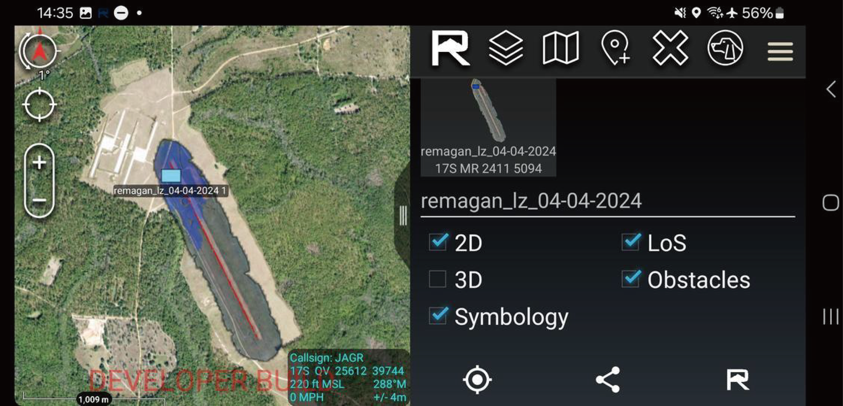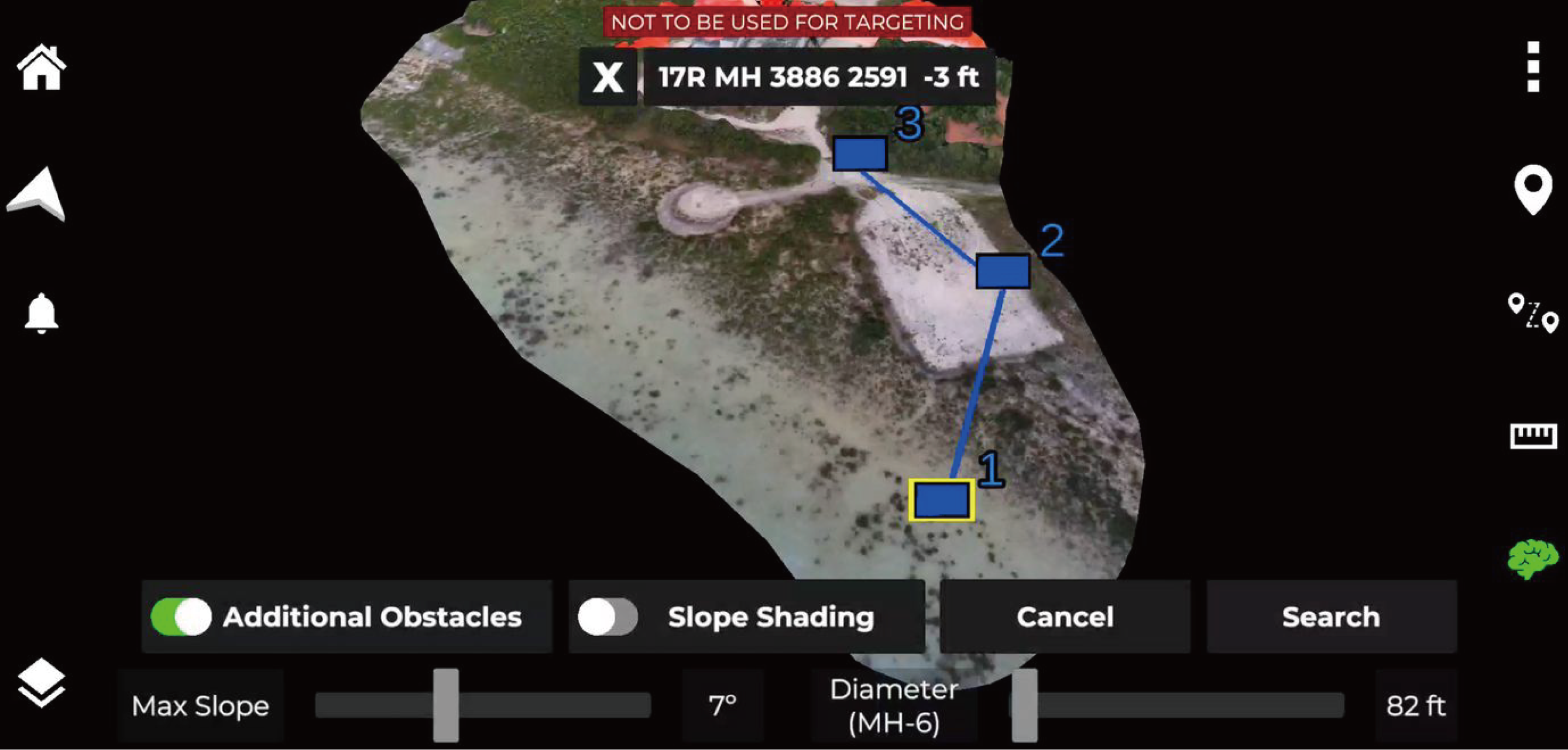 헬리콥터 착륙 지점 (HLZ) 측량 : 지형과 장애물을 분석하고 특정 기체 (MH-6, UH-60 등)의 교리까지 반영하여 최적의 착륙 지점을 추천합니다.